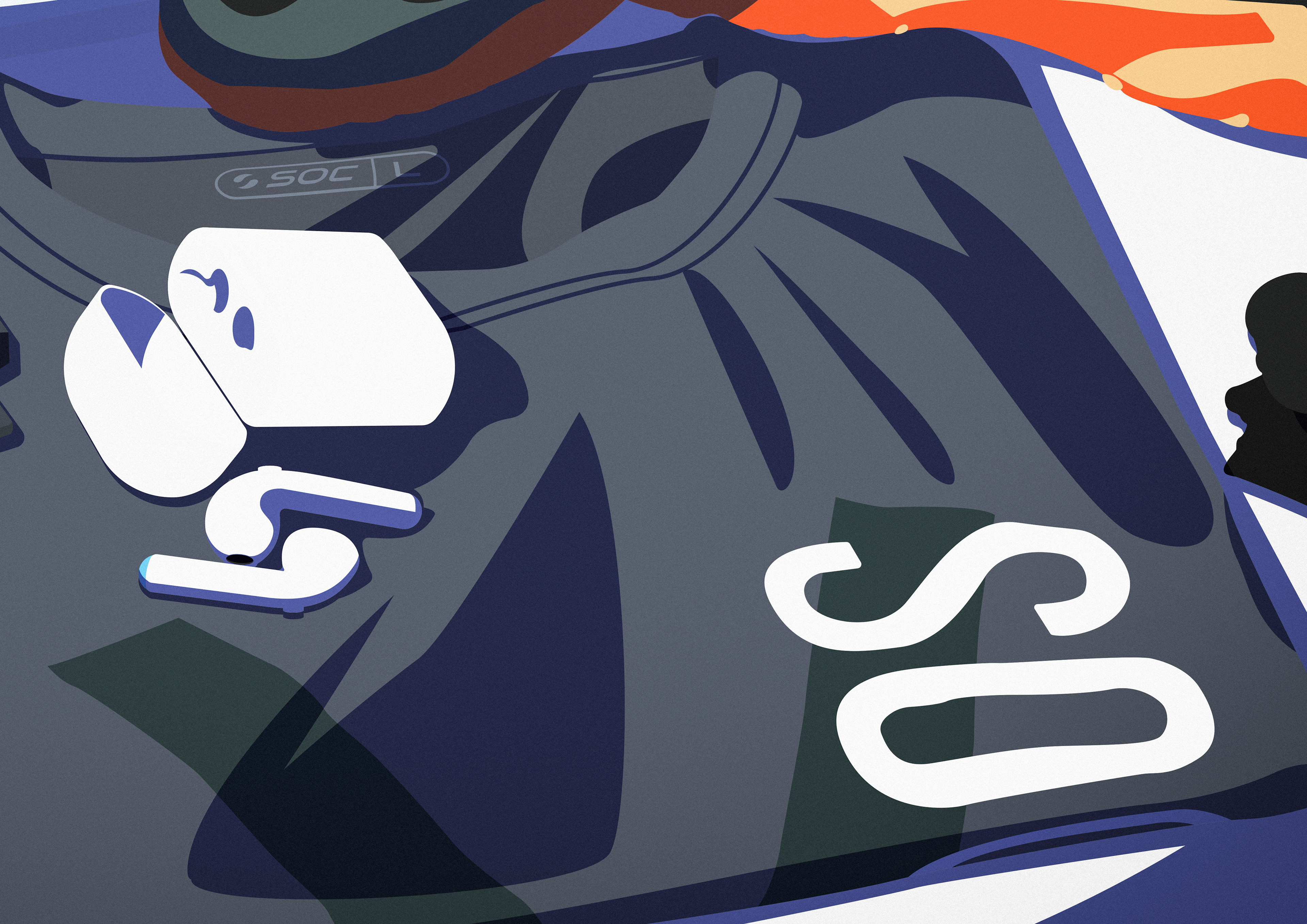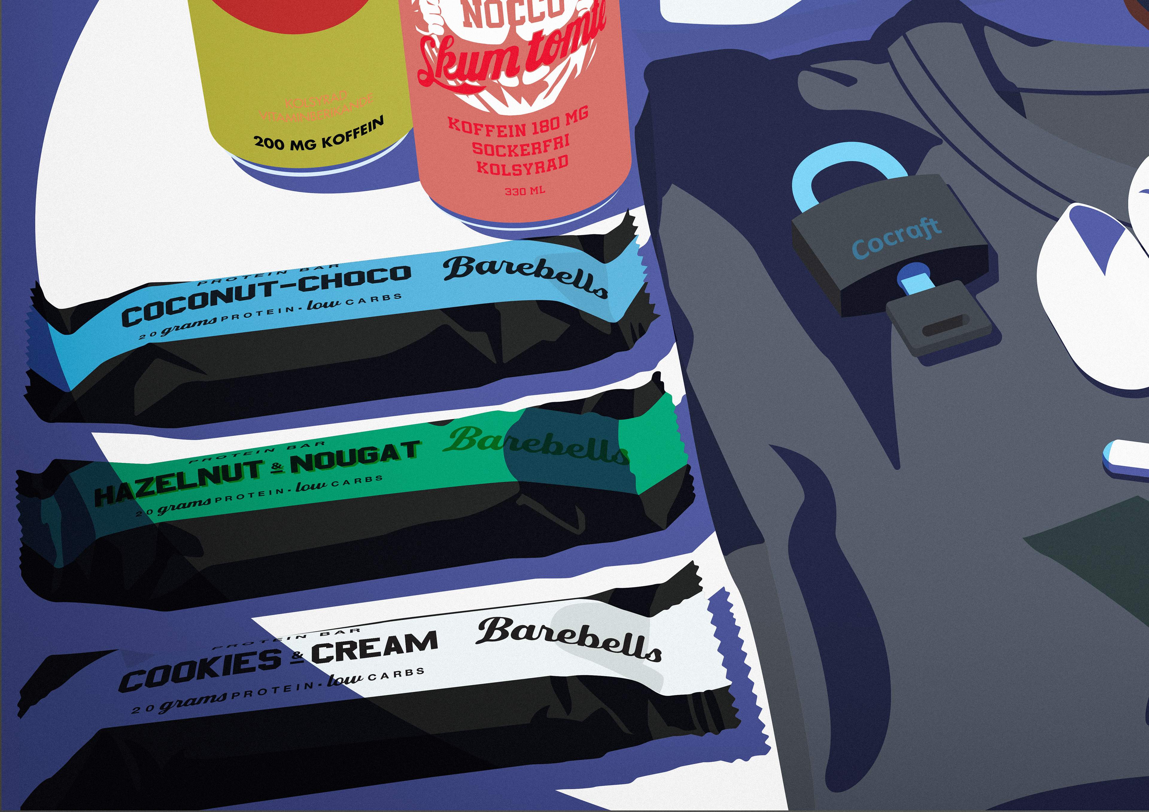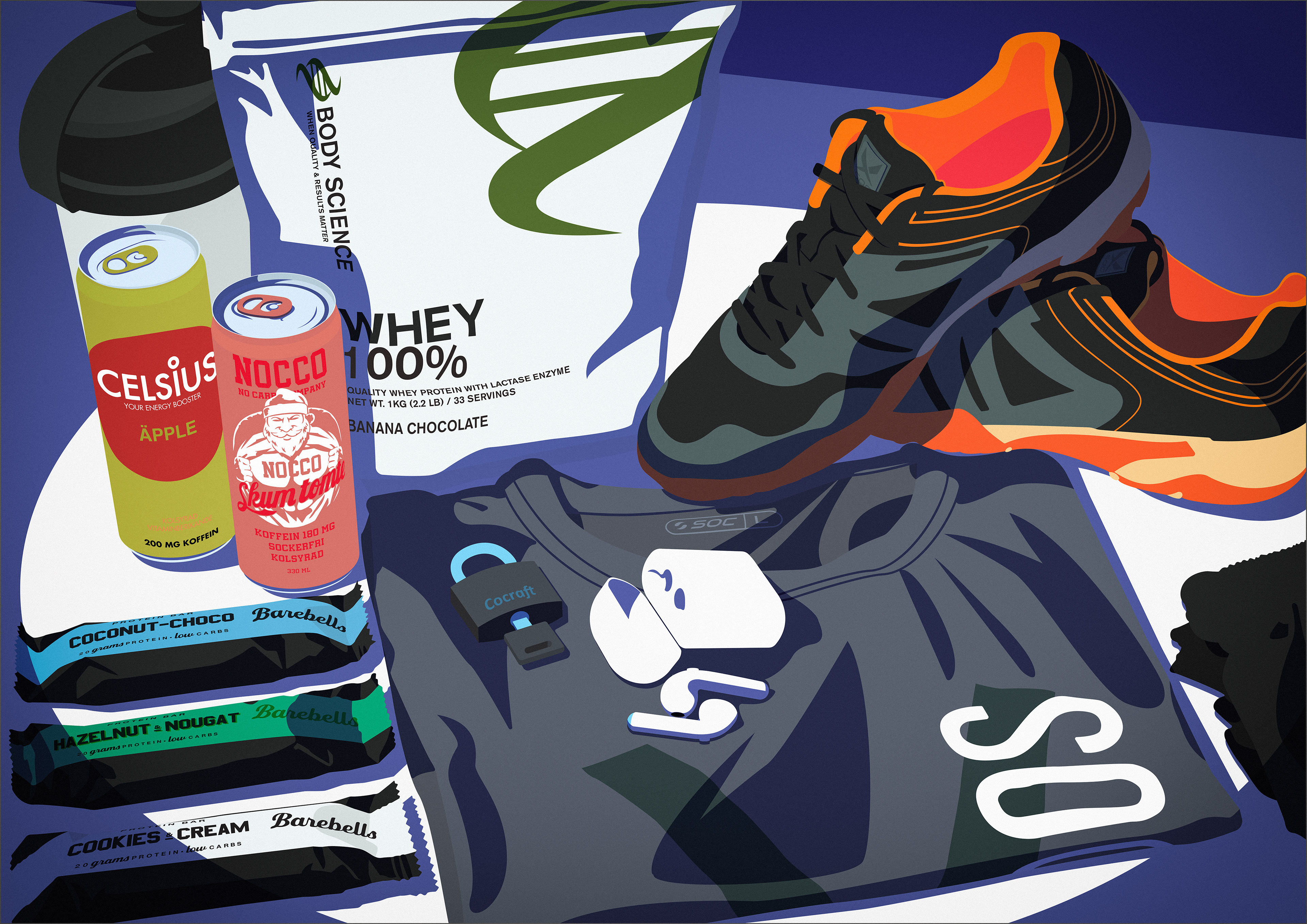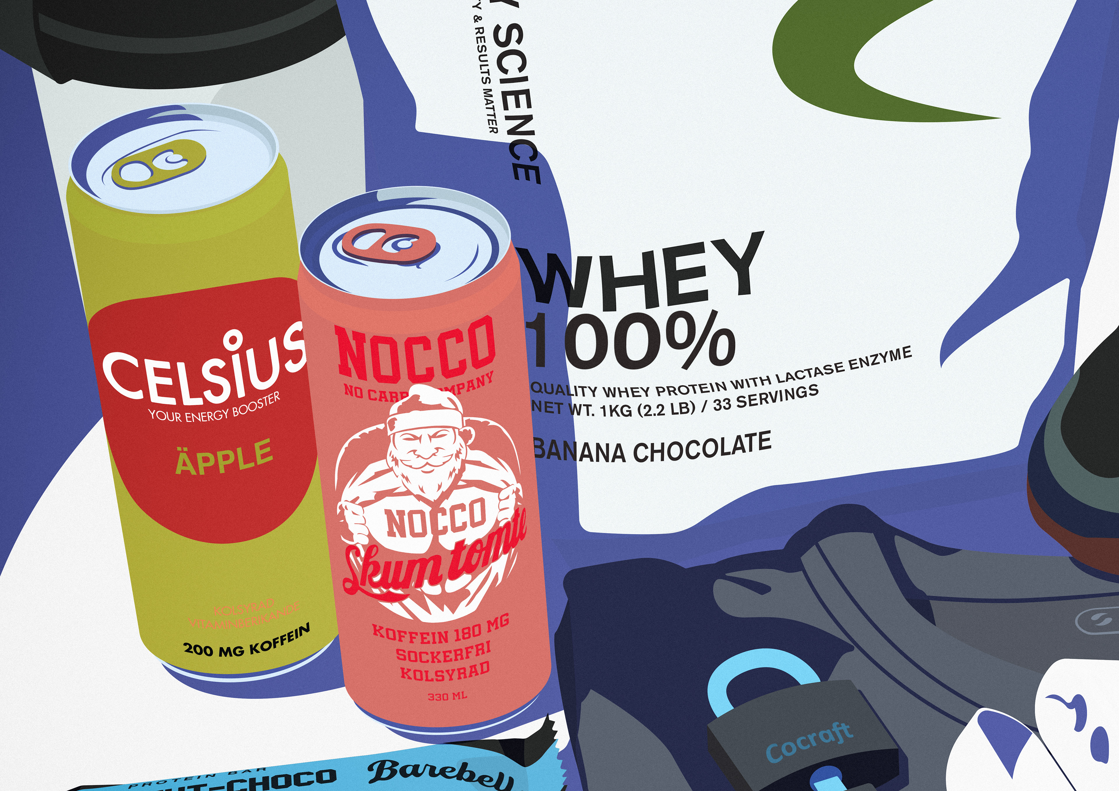 An illustration of a workout kit with some protein bars, energy drinks and other things that might come in handy.
